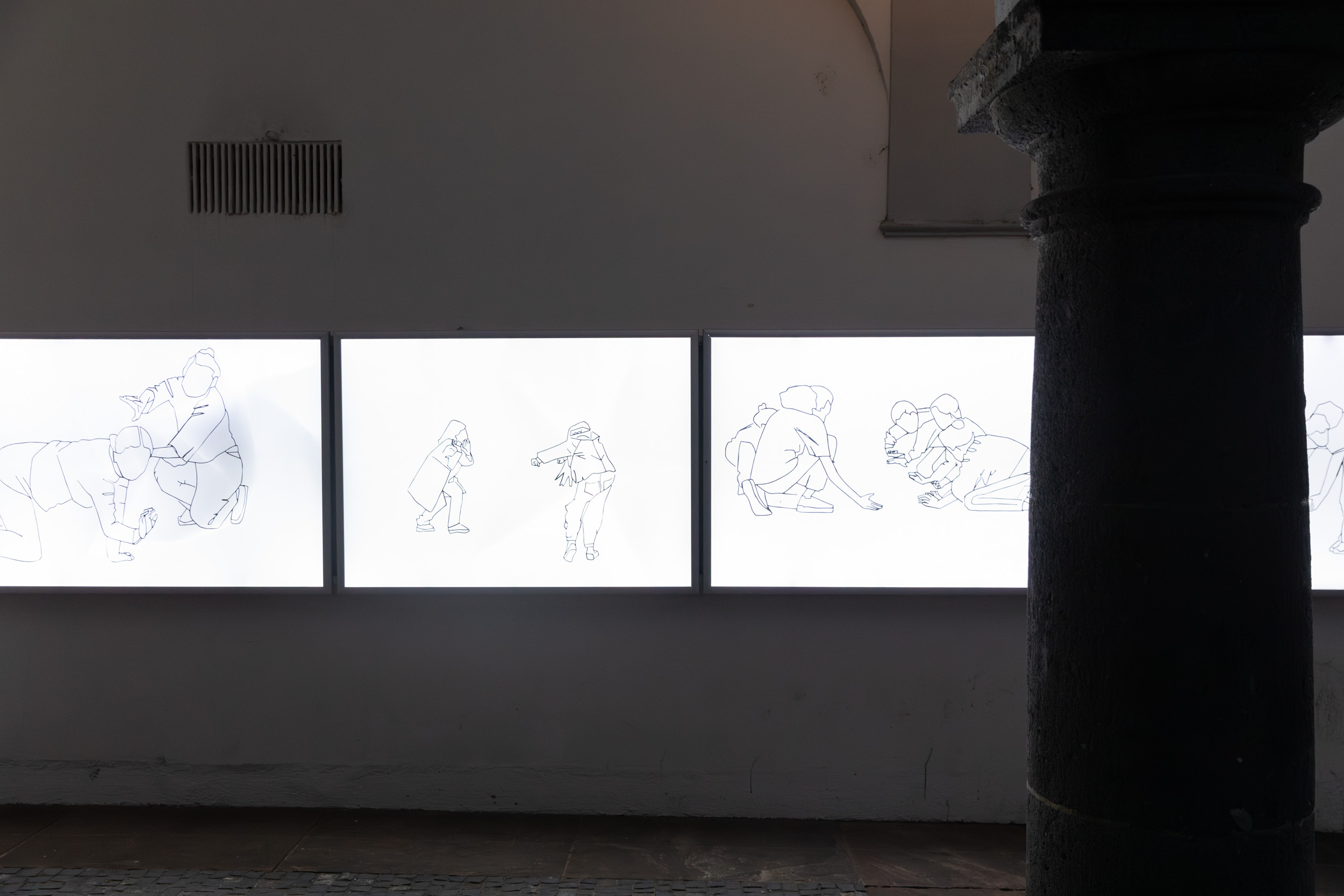 Inspiriert von Musikalben, produziert Natalie Brück das audiovisuelle Album „Ränder dieser Bilder“ für ihre erste institutionelle Einzelausstellung. Zwischen Momenten der Stille, des Zögerns und des Zweifelns zieht sie uns in einen Strudel aus bewegten Bildern, dem Klang ihrer Stimme, dröhnenden Geräuschen, harten und weichen Beats und melodischen Passagen, die uns ständig mit Vereinfachungen komplexer Zusammenhänge bombardieren. Was ist eigentlich richtig und was ist falsch? Was ist mit den Nuancen von Sprache und Bildern - online und offline? Was geschieht an den Rändern dieser Bilder?